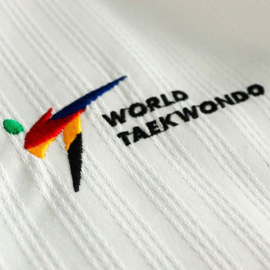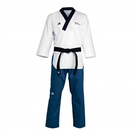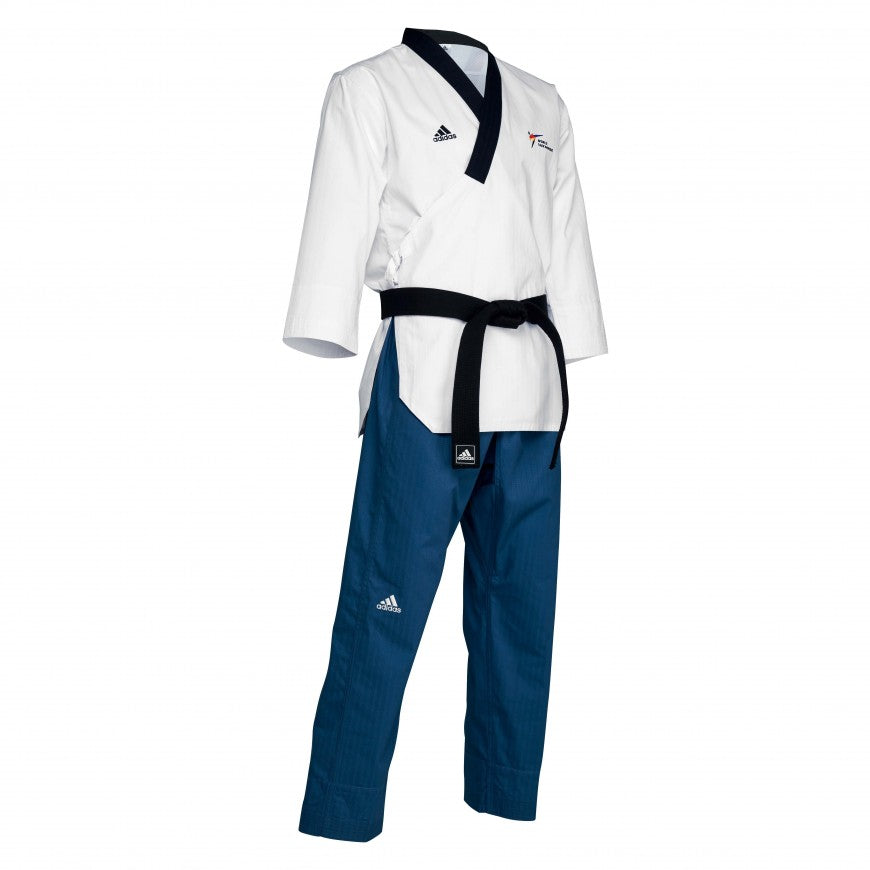 - White jacket with black collar and blue pants. New Adidas poomsae WT dobok for women WT approved. Jackets designed for girls with a V-neck and opening at the front/side of the jacket. Excellent material with resistant structured fabric and reinforcement on the back and on the cuffs of the sleeves and legs