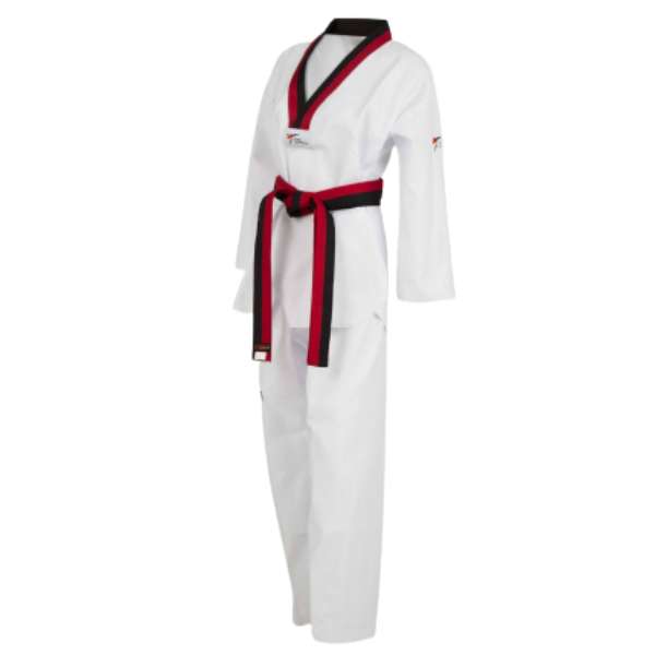 Uniforme de alta calidad, ideal para la práctica y competencia, tela fresca y ligera con mesh en las axilas, uniforme reconocido por la World Taekwondo y la FMTKD, con bordado de la Federación Mexicana de Taekwondo en el brazo derecho y de WT del lado izquierdo.